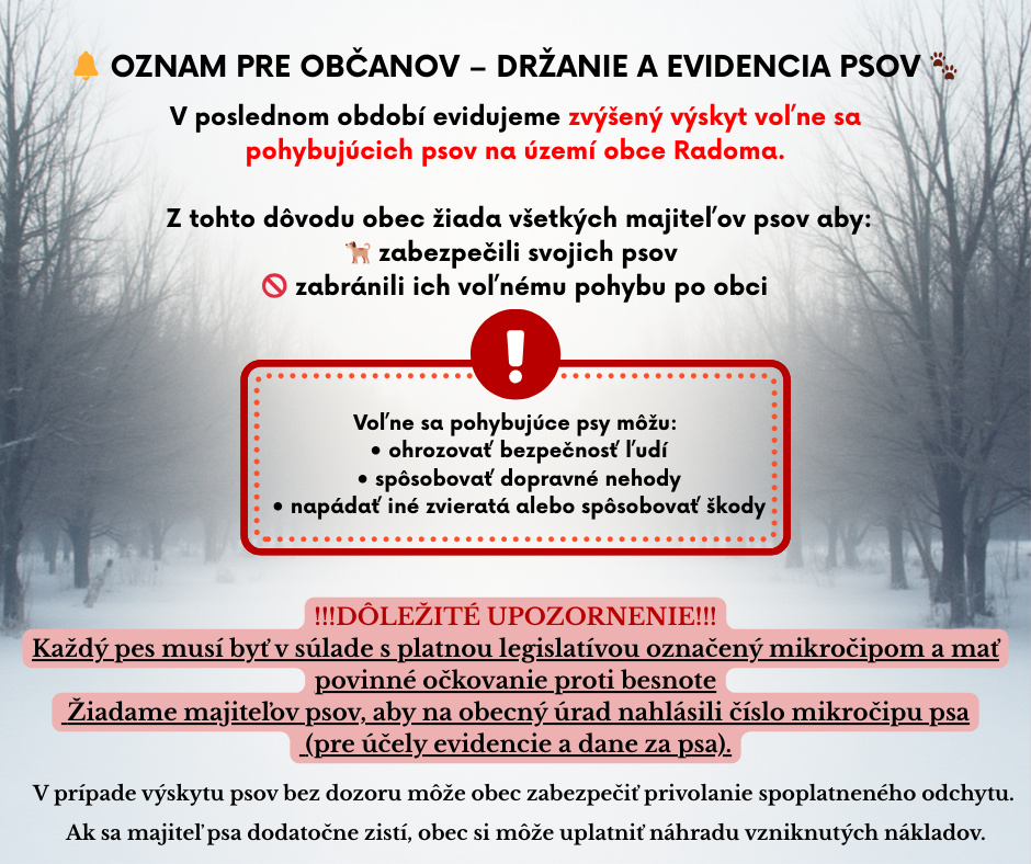 V poslednom období evidujeme zvýšený výskyt voľne sa pohybujúcich psov na území obce Radoma. Z tohto dôvodu obec upozorňuje majiteľov psov na povinnosť zabezpečiť svojich psov a zabrániť ich voľnému pohybu po obci a mimo nej. Zároveň pripomíname, že každý pes musí byť v súlade s platnou legislatívou označený mikročipom a mať povinné očkovanie proti besnote. Majitelia psov sú povinní nahlásiť na obecný úrad číslo mikročipu psa pre účely evidencie a vyrubenia dane za psa, ako aj oznámiť vznik, zmenu alebo zánik chovu psa. V prípade výskytu psov bez dozoru môže obec zabezpečiť privolanie spoplatneného odchytu psov. Ak sa majiteľ psa dodatočne zistí, obec si môže uplatniť náhradu vzniknutých nákladov v súlade s platnými právnymi predpismi. Ďakujeme za pochopenie a zodpovedný prístup. Obec Radoma
